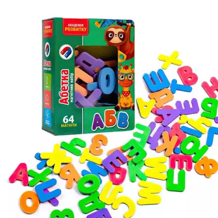 Вивчаємо алфавіт за допомогою м'яких фігурних магнітів! Що робити? Розгляньте разом із малюком фігурні магнітики з літерами. Розкажіть, як називається кожна літера. Коли дитина запам'ятає літери, почніть писати і читати прості слова. Грати та навчатися можна як на холодильнику, так і на будь-якій іншій магнітній поверхні. Особливості: всі магнітики м'які та об'ємні. Їх зручно тримати дитячою ручкою. Граємо та тренуємо: мова, читання, логічне мислення, інтелект, пам'ять та дрібну моторику. Набір містить: 64 магніти. Вік: 4-7 років.