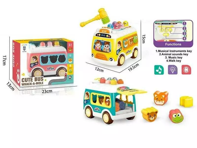 Музичний автобус 0922 (48/2) 2 кольори, мелодії, звуки, підсвічування, сортер, стукалка, колесо вільного ходу, в коробці
