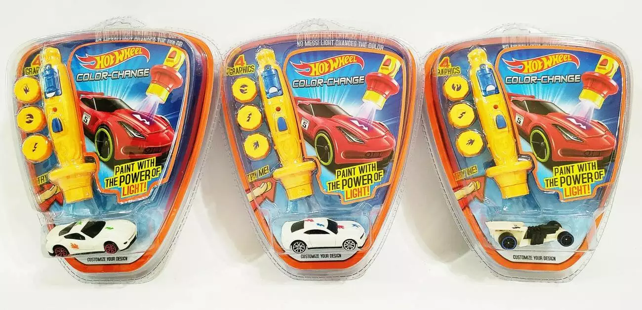 Машинка "Hot Wheel". Має спеціальну поверхню, яка дозволяє змінювати колір автомобіля. Для цього в наборі є спеціальний пристрій "лазер" і 4 насадки з різними трафаретами. Потрібно прикріпити насадку до пристрою і посвітити на те місце на машинці, де Ви хочете намалювати принт. Через деякий час на ній проявиться тимчасовий малюнок. Різні машинки в асортименті. Розмір машинки: 8 см. Упаковка: Планшет Тип ел-тів харчування: Батарейки (LR44) Кількість ел-тів харчування: 3 Ел-ти харчування в комплекті: Є Вага в упаковці: 130 г Габарити в упаковці: 20.5 x 25 x 4 см Габарити без упаковки: 20.5 x 25 x 4 см Країна виробник: Китай Матеріал: Комбінований Комплектація: Машинка, "лазер", 4 насадки