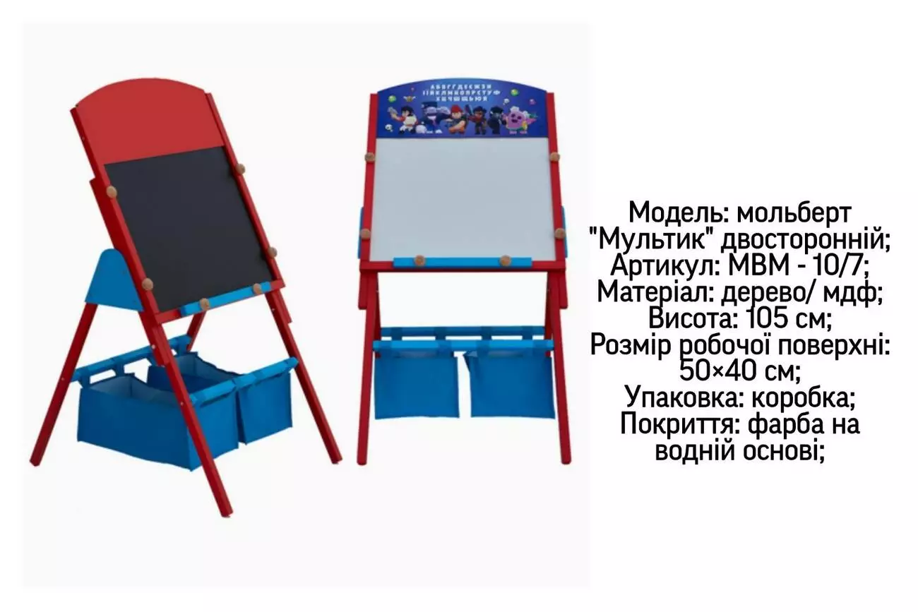 <p><em><strong>Мольберт двусторонний "Маленький всесвіт" "Мультик" МВМ10/7, 500х400 мм </strong></em></p><br /> <p><strong>На данный вид товара дополнительные скидки не распространяются!!!</strong></p><br /> <p>Детский мольберт торговой марки "Маленький всесвіт" помогает малышам не только получать первые знания, но развивать творческие способности, поможет малышу с удовольствием подготовиться к школе: изучить азбуку, цифры, решать математические примеры и рисовать.</p><br /> <p>Рисование способствует развитию воображения, концентрации внимания, поможет подготовить руку ребёнка к письму.</p><br /> <p>Одна сторона черная, можно писать и рисовать мелками. Вторая сторона белая,магнитная. Для рисования маркером и составления слов из магнитных букв. Мольберт устойчив. Занимает мало места.</p><br /> <ul><br /> <li>Производитель: Маленький всесвіт</li><br /> <li>Модель: мольберт "Мультик" двусторонний;</li><br /> <li>Материал: дерево/ мдф;</li><br /> <li>Высота: 105 см;</li><br /> <li>Размер рабочой поверхности: 50?40 см;</li><br /> <li>Упаковка: коробка;</li><br /> <li>Покрытие: краска на водной основе;</li><br /> </ul><br />