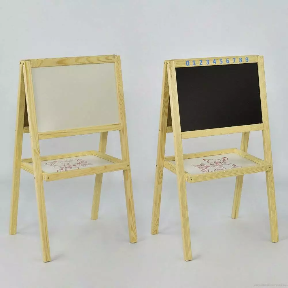 Мольберт виготовлений з дерева. Він стійкий у використанні та зручний в грі. Мольберт має дві різні боки. Одна сторона для крейди, а друга, магнітна дошка - під водні маркери, фарби. Під робочою поверхнею розташована зручна підставка для зберігання аксесуарів і необхідного приладдя. Мольберт стимулює займатися творчістю, що позитивно впливає на дрібну моторику, почуття стилю і композиції. Розмір робочої поверхні: 40х26 см. Розміри / габарити - Довжина (см): 46 см - Висота (см): 82 см