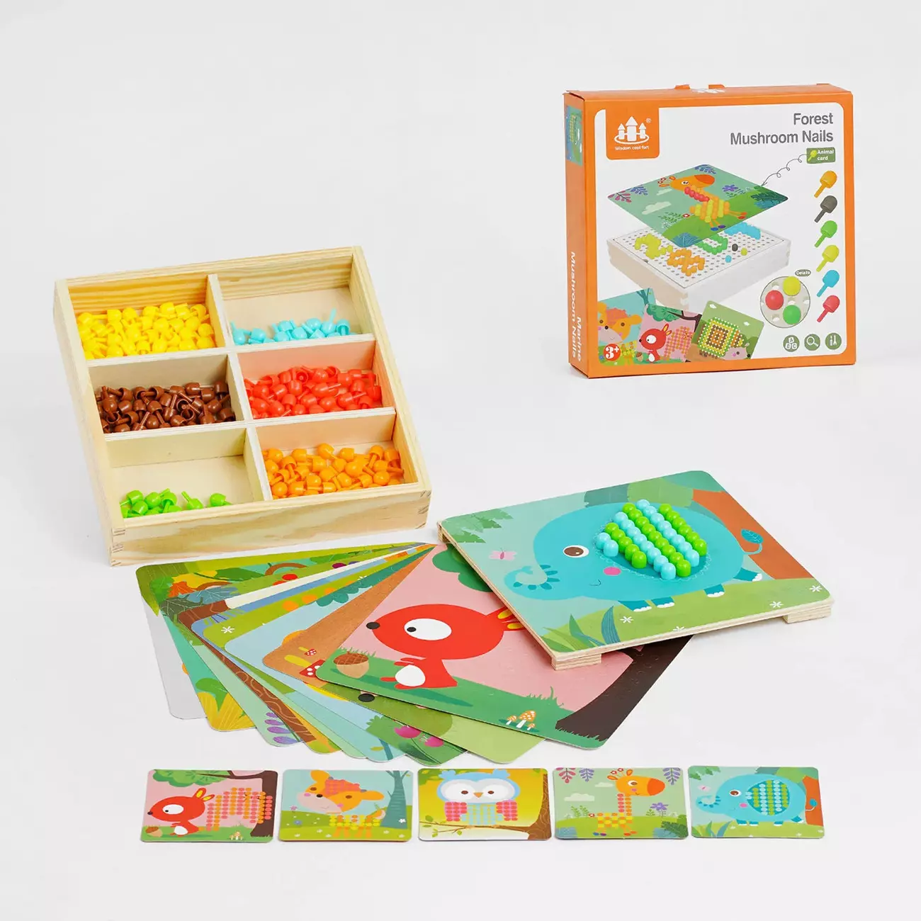 Для дбайливої мами дуже важливо, щоб іграшки дитини були створені з екологічно чистого матеріалу. Саме тому всі батьки стали частіше обирати іграшки виготовлені з дерев'яних матеріалів. Ми представляємо вашій увазі неймовірну мозаїку з різними картинками. Саме такий набір дозволить дитині розвинути дрібну моторику рук, логічне мислення та подарувати незабутні емоції від гри. Особливості: - іграшка виконана з екологічно чистих матеріалів; - основа гри - платформа з отворами для мозаїки; - у наборі є 10 карток з різними тваринками; - в коробці складена мозаїка для збирання картинок; - іграшка дозволить дитині розвинути усі необхідні навички на етапах дорослішання.