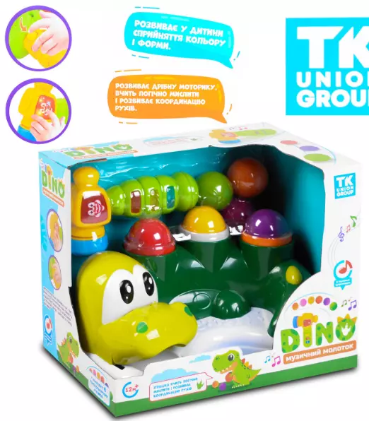TK Group представляє свою новинку - музична гра 69411! Чудова дитяча гра "Dino музичний молоточок" для розвитку дрібної моторики рук, виконана у привабливому дизайні - динозавр. Гра стукача покликана скрасити повсякденне дозвілля і допомогти малюкові розвинути: зап'ястя, пальці, силу удару та логічне мислення. Хід гри: 1. Вставте в отвір кульку. 2. Візьміть у руки молоток і м'якою стороною вдарте по кульці. 3. Кулька повинна викотитися з пащі динозавра. Ігровий молоточок оснащений яскравими ефектами: - підсвічування корпусу - синім, червоним та білим кольором; - кумедні звуки; - 1 мелодія. Отвори для кульки пофарбовані в різні кольори, якщо підбирати кульку за кольором або тоном, то іграшка виконуватиме функцію сортера. Іграшка включає в свою комплектацію: - заснування; - музичний молоток; - 6 кульок для гри. Молоток працює від 2-х батарейок типу "АА" - не входять до комплекту.орами.