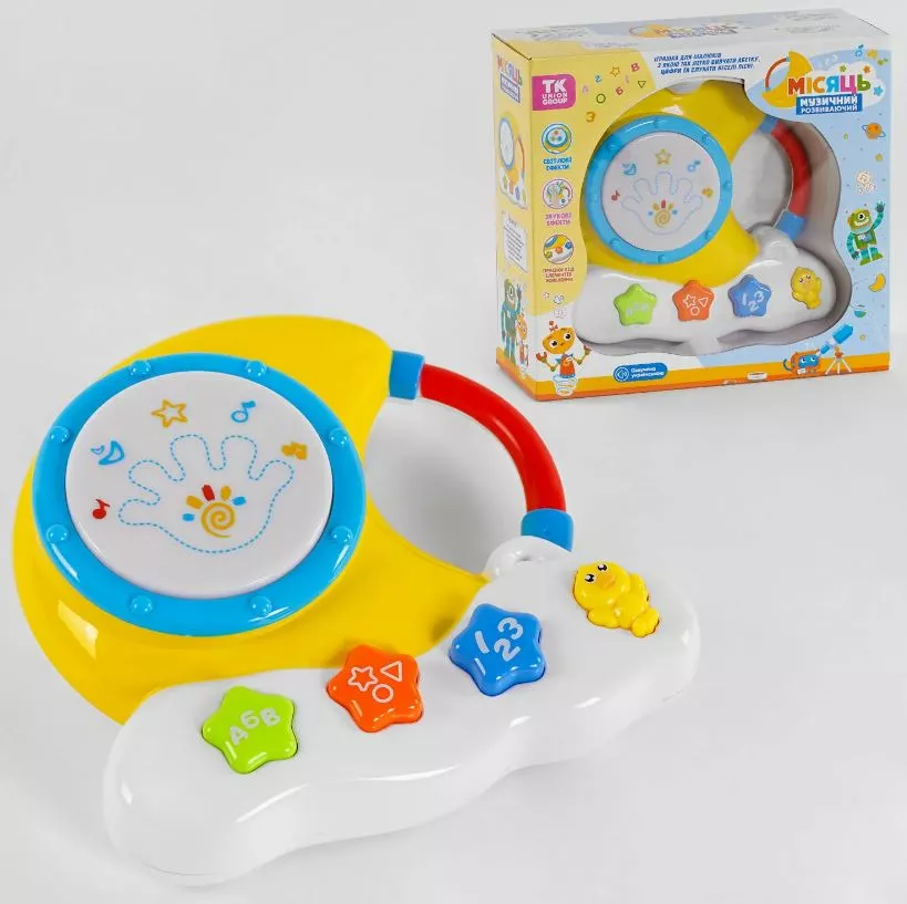 Одного разу взявши в ручки цю чудову музичну іграшку, ваш малюк не зможе від неї відірватися. Виробник "ТК Union Group" постійно дбає про те, щоб іграшки приносили максимальну користь дитині під час простої та веселої гри. Розвивальна іграшка “Місяць” сприяє розвитку зорової та слухової пам'яті, дозволяє розвивати здатність зосереджувати увагу на певному занятті, допомагає малюкам розвивати творчі здібності, точність рухів. З нею дитина легко вивчити український алфавіт, назви геометричних фігур та навчитись рахувати до 10. Особливості: - відповідає технічному регламенту безпеки іграшок; - іграшка виконана з якісних полімерних матеріалів; - LED-підсвічування; - працює від 3-х батарей АА (не входить до комплекту); - барвистий та дуже привабливий дизайн; - зелена зірочка відтворює 33 літери українського алфавіту; - помаранчева зірочка відтворює назви геометричних фігур; - синя зірочка навчити дитину рахувати до 10; - пташеня дозволити малюкові потанцювати під веселі українські пісеньки; - у центрі іграшки розташовується барабан.