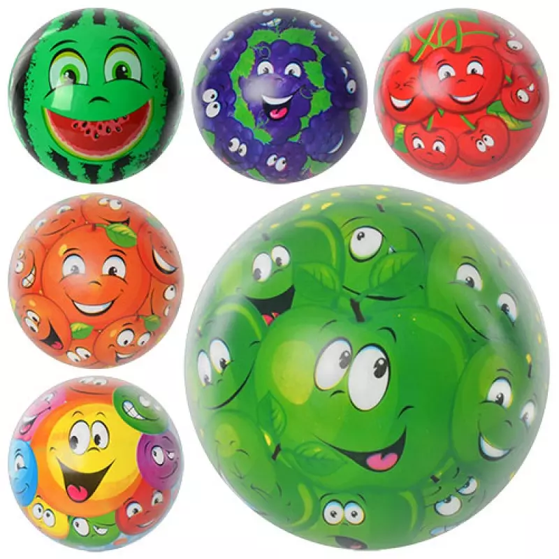 М'яч дитячий сподобається як хлопчикам, так і дівчаткам. Така іграшка розвиває дрібну моторику рук і пальців у дітей. Яскраві і різні малюнки на м'ячі сподобаються всім діткам. В асортименті представлено 5 видів м'ячів (ягоди і фрукти). М'яч важить 75 грам, виготовлений з ПВХ. Розмір 9 дюймів