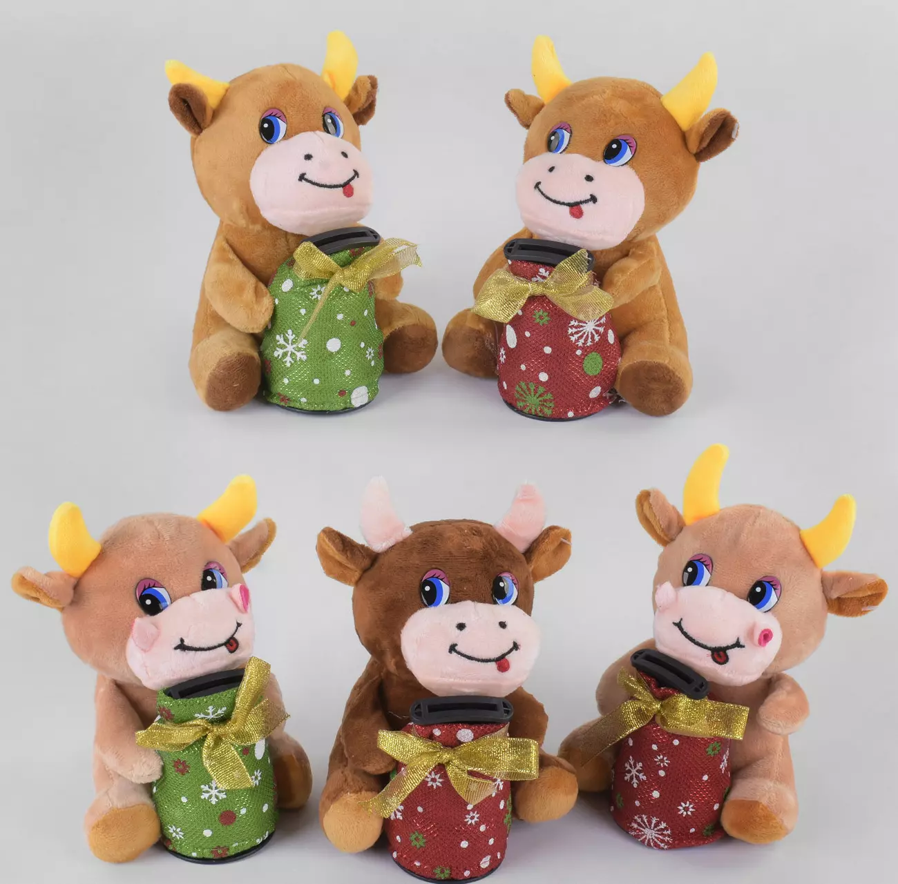 Святкова скарбничка в формі бичка - це яскравий і тематичність подарунок для дітей будь-якого віку. М'який бичок зручно сидить на задніх ніжках і тримає в ручках пластмасовий, обшитий блискучою тканиною мішечок-скарбничку. Скарбничка відкривається знизу, завдяки пластмасовій кришечки, а коли закидає монетка, корівка, співає пісеньку російською мовою. Висота іграшки - 17 см. В асортименті - 5 видів.