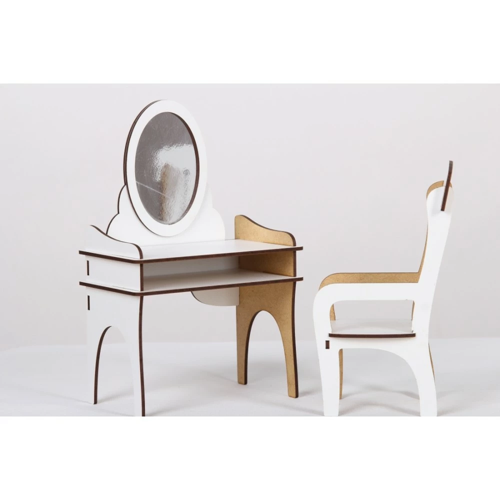Набір 1: трюмо + стілець для ляльок до 30 см (Барбі, Братц, Монстр Хай). Матеріал: ДВП ламіноване і шліфоване. Розмір: 26,5 * 26,2 * 12 см. Вага 510г. Упаковка: пакет. Для дітей від 3-х років під наглядом дорослих (може містити дрібні предмети). Зберігати при t від 5 до 26 С, відн.вологість 50-80%. Тримати подалі від вогню, води і механічних пошкоджень. Термін придатності необмежений.