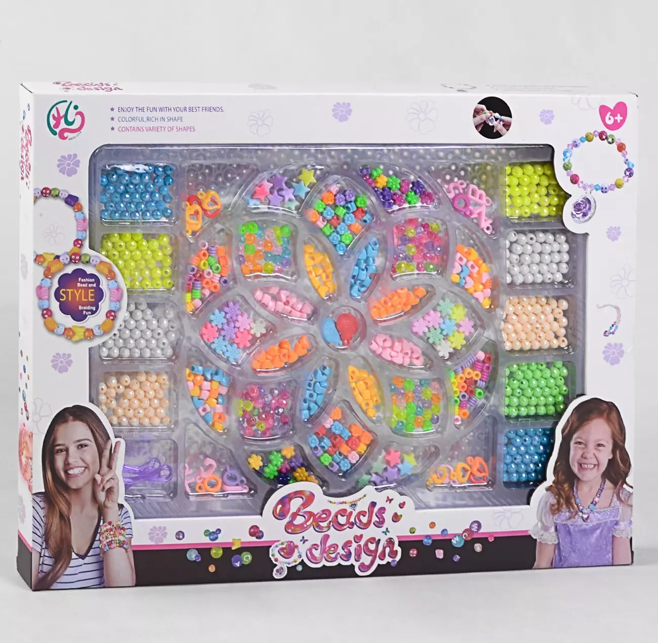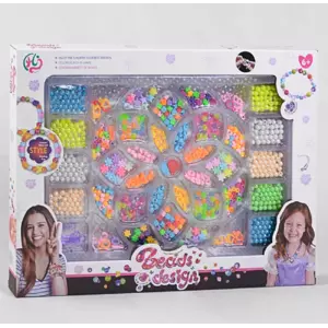 Набір бісеру "Beads design" 564 відмінно підійде для маленької модниці і безсумнівно порадує її! У комплект входить близько 10 видів намистин на будь-який смак і колір: різноманітні квіточки, сніжинки, кульки, сердечка, літери, черепашки, зірочки. Також у наборі є 2 моточки волосіні. Самі намистини виготовлені з первинного пластику та пофарбовані в яскраві кольори, що посприяють створенню найкрасивіших і неповторних прикрас. Набір розвиває креативність мислення і дрібну моторику рук. На зворотному боці коробки можна знайти кілька варіантів прикладу виробів. Ви зможете з них зробити красиві браслети, фенечки дружби, модні сережки і стильні намиста!