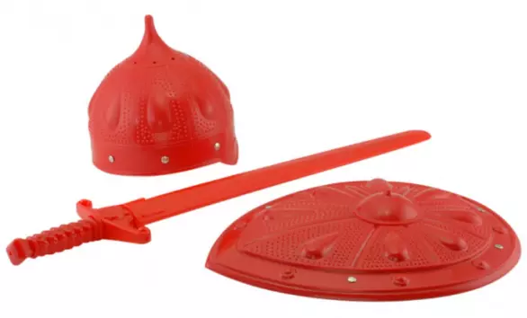 Набір "Богатир". З таким озброєнням не страшний жоден злий розбійник чи підступний супротивник-лицар – справжня мрія для будь-якого хлопця! Активні, рухливі ігри дуже важливі для правильного фізичного розвитку дитини, а якщо підключити фантазію та вигадати цікаві сюжети для таких ігор з мечем, то це корисно подвійно, тому що дитина, граючи, розвиває спритність, координацію рухів, влучність і, звичайно, уяву. Усі складові комплекту виконані дуже реалістично, з ретельним опрацюванням усіх деталей. Зручний шолом, що закриває всі вразливі частини голови, легкий, зручний щит і ергономічний меч, практично невагомий і маневрений - все це робить гру більш захоплюючою і зводить до нуля ймовірність травми. Іграшки виготовлені з пластику високої якості, що не втрачає свій колір, не схильного до сколів і стійкого до подряпин, абсолютно безпечної для здоров'я дитини. меч, шолом, щит.