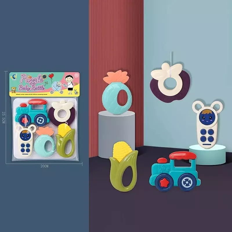 Милий набір брязкалець для малюків з приємним дизайном містить в собі 5 елементів, які відрізняються за формою, кольором та фактурою. Такий набір подарує незабутні емоції для дитинки та гарно розвине дрібну моторику, сприйняття кольорів, форм та звуків. Особливості: - набір включає 5 різних елементів, серед яких брязкальця з гумовими прорізувачами; - цікаві та незвичайні форми іграшок; - іграшки відрізняються приємною колірною гамою; - прорізувачі посприяють значному полегшенню під час прорізання зубів; - виконані з первинного пластику, безпечного для дітей; - не містять шкідливих барвників.