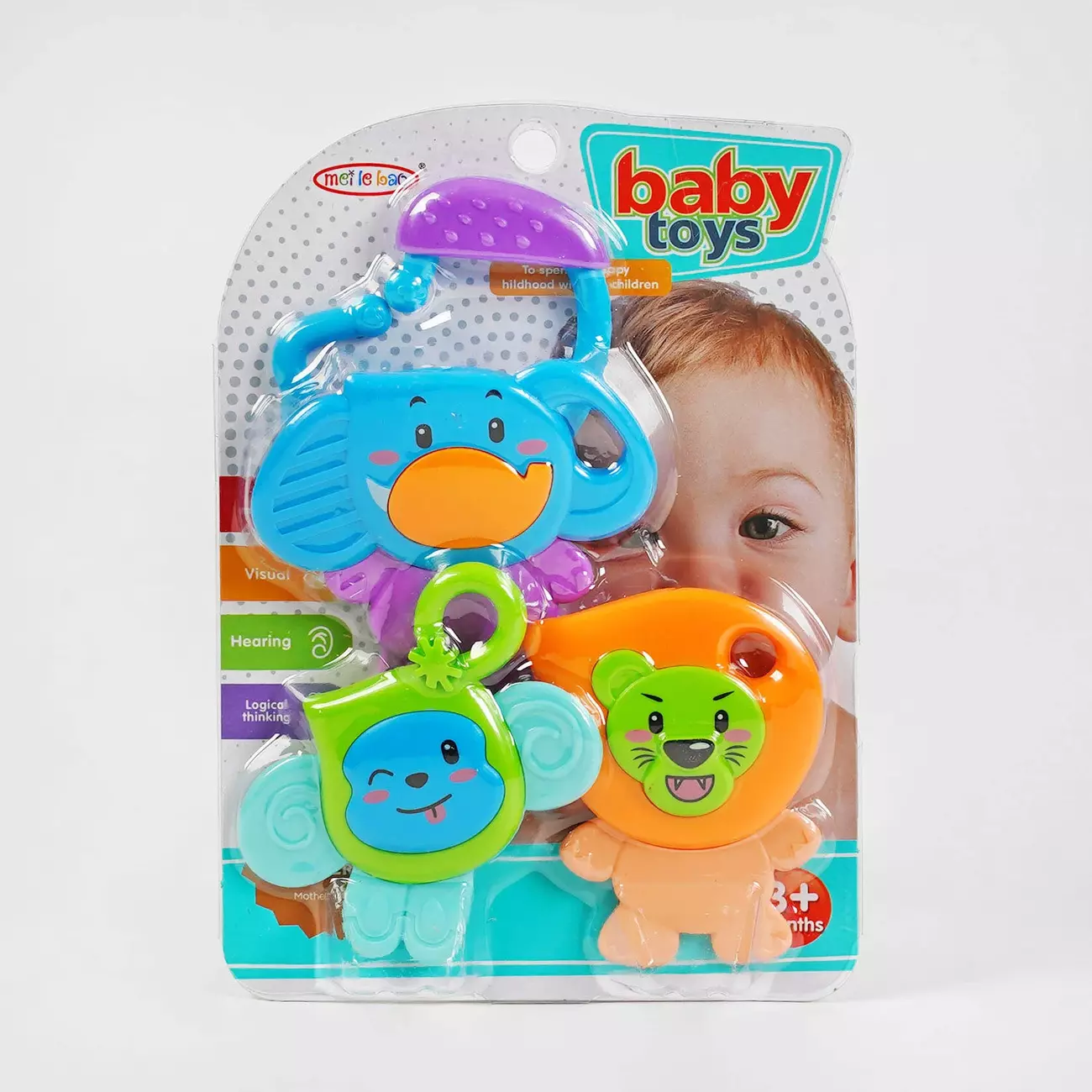 Брязкальця є важливими іграшками для малюка, вони беруть активну участь у формуванні реакцій, знайомлять з різними текстурами й звуками. Вони стимулюють загальний розвиток дитинки, допомагають розвинути відчуття дотику, координацію рухів, моторику та почуття слуху. А завдяки своєму милому вигляду та яскравим кольорам заспокоюють малюка та захоплюють його увагу. Особливості: - до набору брязкалець входять 3 веселих тваринки та кільце, на якому можна зручно розташувати всі фігурки; - звук брязкальця — негучне потріскування; - гарний дизайн; - яскраві кольори; - фігурки мають різні фактури; - тваринки виконані з якісного пластику, який є безпечним для немовляти.