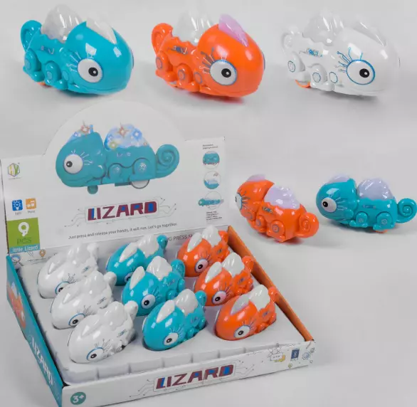 Зустрічайте яскравого та дуже технічного хамелеону Lizard. Високоякісна, заводна іграшка-машинка виконана з первинної пластмаси, де якість видно неозброєним оком. Вся модель прикрашена сучасним малюнком, який робить із простого хамелеону – техно робота! У колекцію увійшло 3 кольори: бірюзовий, білий та помаранчевий. У хамелеона велика голова з величезними і дуже гарними очима, хвостик закручений у спіральку, а ніжки оснащені тріскачкою та рухливі. Якщо натиснути йому на спинку, то коліщатка заведуть і жваво поїдуть вперед. Знизу є кнопка перемикач, як тільки Ви активуєте іграшку, зазвучить весела пісенька, а спинка та чубчик засвітяться різними кольорами. У блоці 9 іграшок: бірюзового, білого та оранжевого кольору.