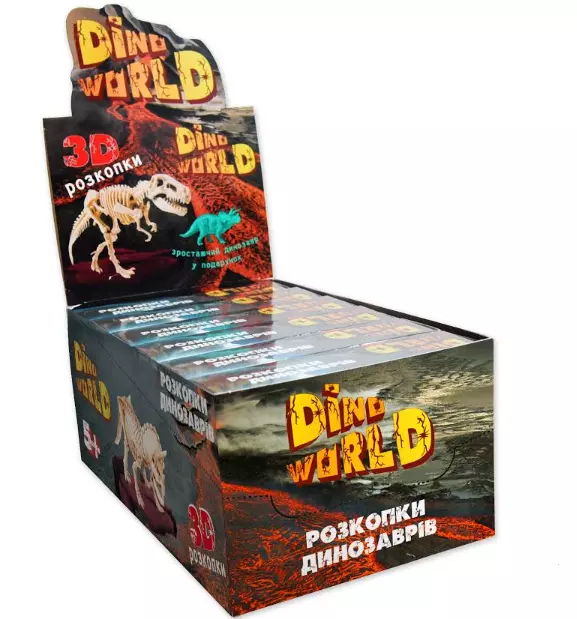 Набір для проведення розкопок "DINO WORLD". У цій коробці знаходиться пласт скам'янілої земної породи з справжніми копіями скелетів динозаврів, а також археологічний набір інструментів, необхідних для проведення розкопок. Барвиста інструкція, допоможе правильно підійти до процесу розкопок і в цікавій ігровій формі повідає вам про деякі історичні факти, знайдених динозаврів!