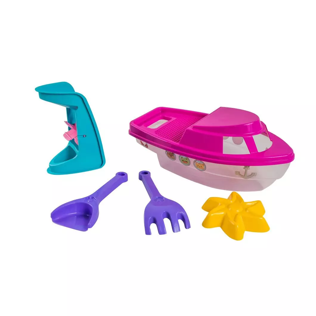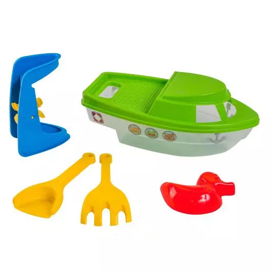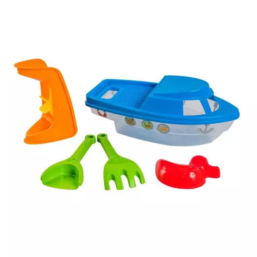 Набір для піску "Кораблик" 6 ел. з млинком поєднує в собі функції іграшки і пісочного набору. Кораблик виконаний у вигляді лотка, що складається з 2х частин. Кольоровий верх кораблика виконує роль сита. Малюк може його тримати за зручну ручку –отвір. Нижня прозора частина виконує роль ємності для піску за допомогою якої можна побудувати вежу з піску, а також лотка для перенесення аксесуарів для піску. Сам кораблик чудово тримається на воді і в ньому можна перевозити не важкі грузи. Також в набір входить млиночок для піску, пасочка і лопатка і грабельки. Упаковка – сітка.