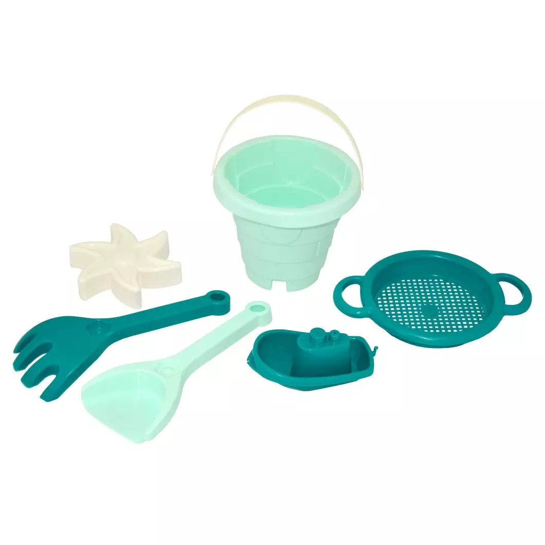 Набір для піску «Вежа» - ідеальний вибір для ігор у піску і воді. До набору входить 6 елементів: лопатка, грабельки, 1 формочка, кораблик, ситечко і відерце у вигляді вежі замку. Ігри набором розвивають уяву і творче мислення, рухову активність дітей, сприяють покращенню зорово-рухової координації, а також спонукає до комунікації з іншими дітьми. Іграшки виготовлені в трендових кольорах 2021 року. Всі елементи виготовлені з високоякісних безпечних матеріалів, стійких до погодних умов. Для дітей від 1 року Пакування - сітка.