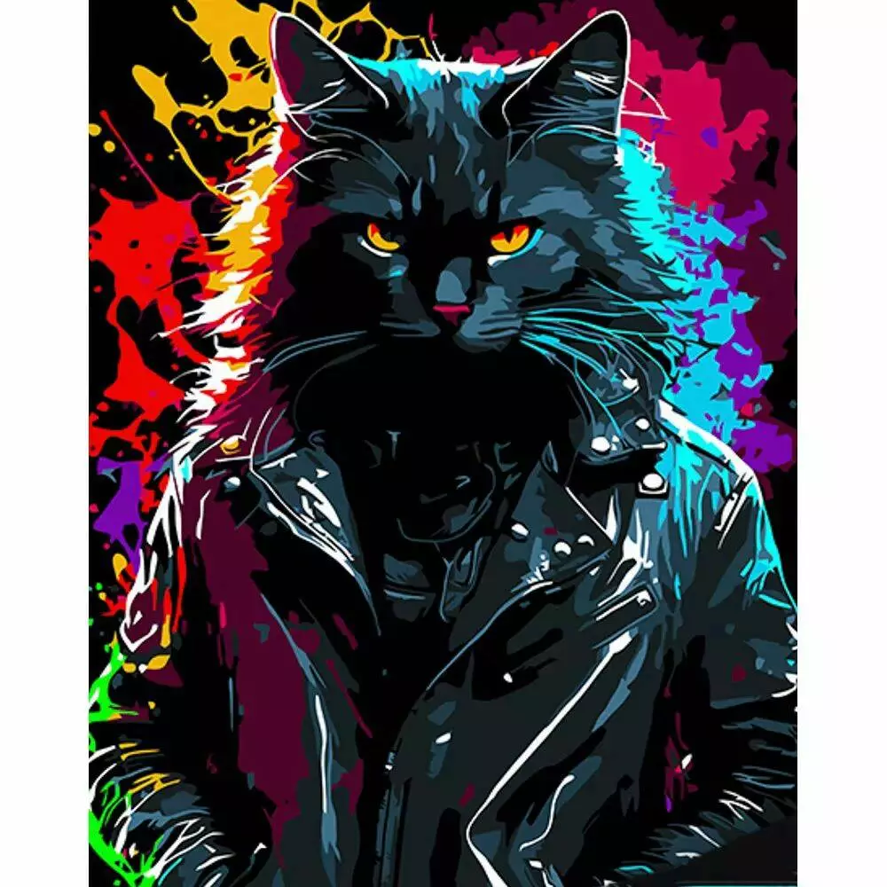 Набір для розпису по номерах Брутальний кіт у курточці Strateg на чорному фоні розміром 40х50 см (AH1015)