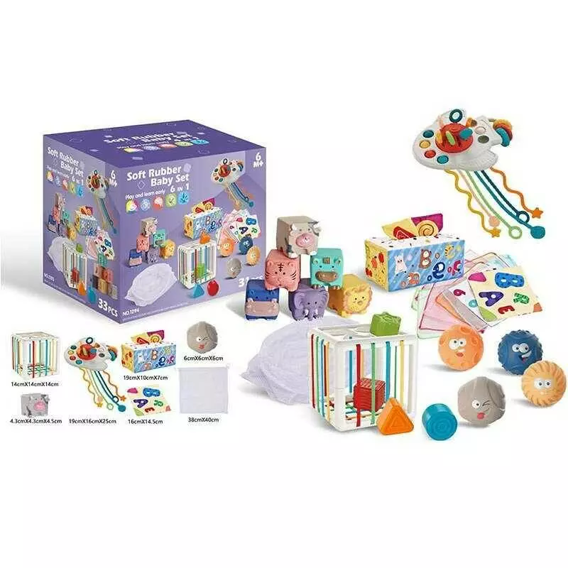 Набір для розвитку 1294 (18), 31 елемент, брязкальця, кубики, прорізувачі, пальчикові ігри, м’ячики, текстильні серветки, мішечок, куб із формами, в коробці