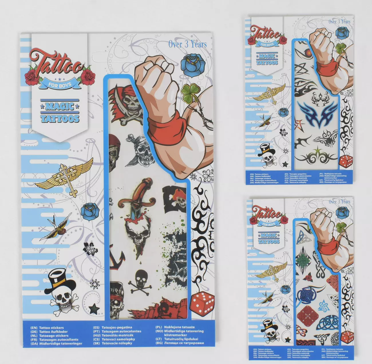 Коли приходить літо, кожна дитина хоче прикрасить своє тіло яскравими і стильними малюнками, які так легко знімаються з шкіри. Татуювання 8208 представлені для хлопчиків в 3х видах: - піратська символіка; - окультні орнаменти; - абстракція. В упаковці Ви знайдете 2 листи на яких знаходяться татуювання, всього від 30 до 40 малюнків. Інструкція із застосування: 1. Виріжете необхідний малюнок. 2. Зніміть захисну плівку. 3. Прикладіть тату стікер до руки липкою стороною і намочіть папір великою кількістю води. 4. Зачекайте 5-10 хвилин. 5. Зніміть тату стікер і легенько протріть малюнок на руці, щоб зняти залишки вологи..