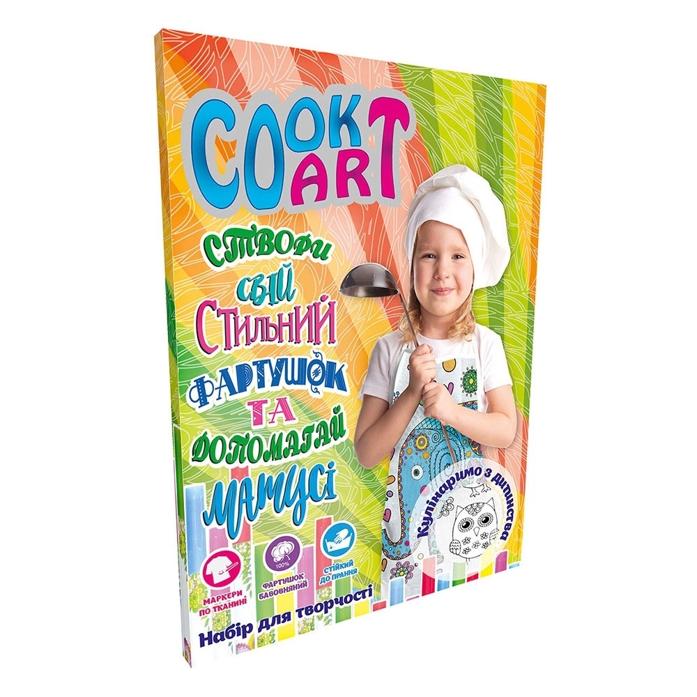 Набір для творчості "Cook Art" (укр.). У наборі: бавовняний фартух, стійкі до прання маркери по тканині. З таким набором, дівчинка зможе проявити свою фантазію і креативність. А в готовому Фартух, приємно буде створювати свої кулінарні шедеври. Розмір упаковки: 30 * 20,8 * 14см Упаковка: Коробка.