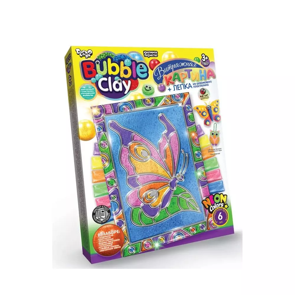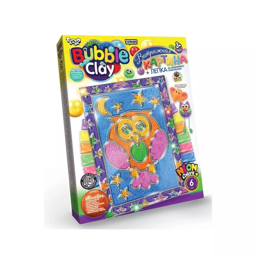 "BUBBLE CLAY вітражна картина" – це набір креативної творчості, що складається з прозорої форми-заготівлі, кулькового пластиліну, покращеної формули, «живих очей», магнітної стрічки та покрокової інструкції «Майстер-Клас». Зробити чудовий шедевр своїми руками – досить просто! Візьміть прозору форму заготівлі та заповніть її пластиліном. Ви можете "розфарбувати" картину по-своєму або зробити приклад на нашій упаковці.