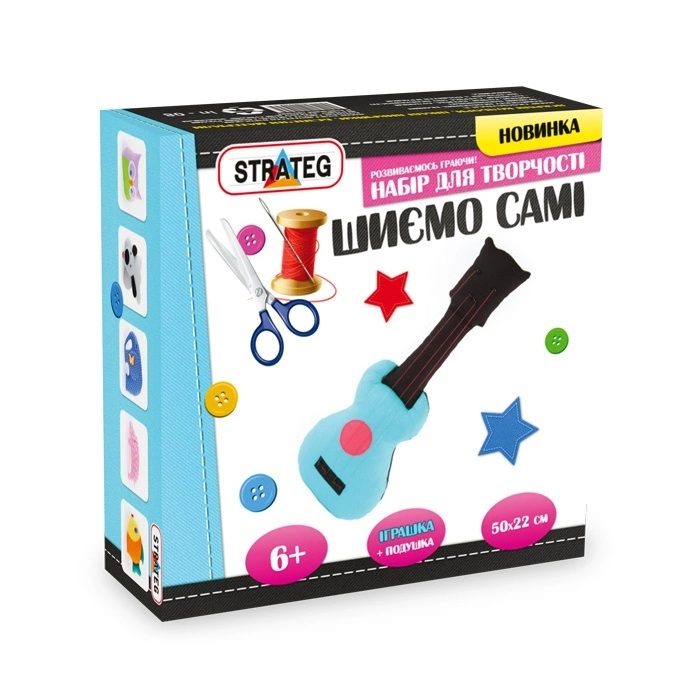 Подаруйте своїй дитині можливість створити чарівну іграшку! У наборі для дитячої творчості "Шиємо самі. Гітара "(іп-05) від компанії Strateg є всі матеріали, які знадобляться для шиття: форма іграшки, комплект тканин для шиття, м'який наповнювач, нитки, голки, крейда, швейні шпильки, намистини а також детальна інструкція з описом роботи. Таке заняття добре підійде для дітей у віці з 6-и років. Процес шиття позитивно впливає на розвиток координації рухів, дрібної моторики, фантазії, акуратності, терпіння і звичайно, креативних здібностей. Цей набір не тільки допоможе цікаво провести час вдома з дитиною, а й урізноманітнює заняття в школі або на творчому гуртку. А власноруч пошитому іграшкою буде приємно прикрасити дитячу або піднести її в якості подарунка! Вік: 6+. Пол: хлопчик / дівчинка. Мова російська Комплект: форма, клапті тканини, наповнювач, нитки, голки, шпильки, крейда, намистини, інструкція. Матеріал: текстиль. Упаковка: картонна коробка. Розмір упаковки: 35х35х11,5 см.
