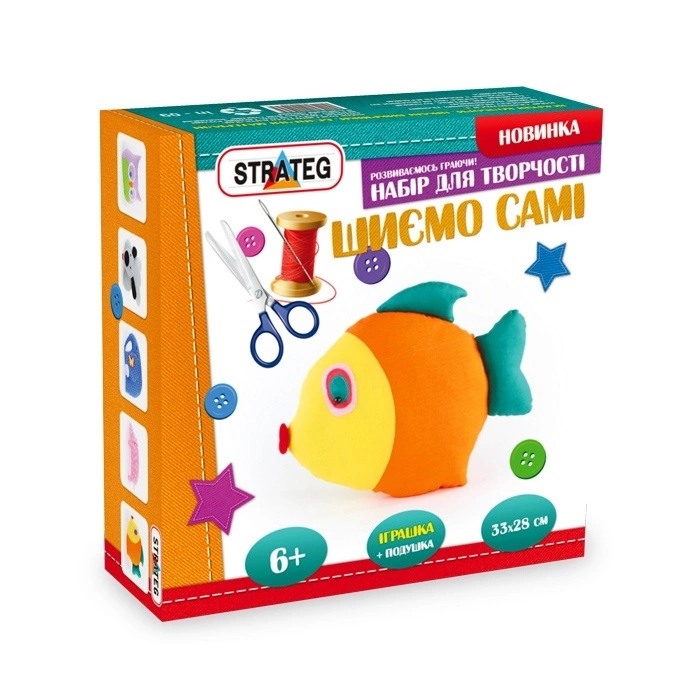 Подаруйте своїй дитині можливість створити чарівну іграшку! У наборі для дитячої творчості "Шиємо самі. Рибка "(іп-06) від компанії Strateg є всі матеріали, які знадобляться для шиття: форма іграшки, комплект тканин для шиття, м'який наповнювач, нитки, голки, крейда, швейні шпильки, намистини а також детальна інструкція з описом роботи. Таке заняття добре підійде для дітей у віці з 6-и років. Процес шиття позитивно впливає на розвиток координації рухів, дрібної моторики, фантазії, акуратності, терпіння і звичайно, креативних здібностей. Цей набір не тільки допоможе цікаво провести час вдома з дитиною, а й урізноманітнює заняття в школі або на творчому гуртку. А власноруч пошитому іграшкою буде приємно прикрасити дитячу або піднести її в якості подарунка! Вік: 6. Пол: хлопчик / дівчинка. Мова російська Комплект: форма, клапті тканини, наповнювач, нитки, голки, шпильки, крейда, намистини, інструкція. Матеріал: текстиль. Упаковка: картонна коробка. Розмір упаковки: 35х35х11,5 см.