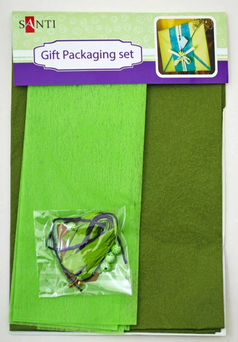 Набір включає: 1 аркуш паперу тишею 40 х 55 см (20 г / м2), 1 аркуш обгорткового паперу 40 х 55 см (58 г / м2), 1 набір аксесуарів (намистини, крафт етикетка, паперова мотузка).