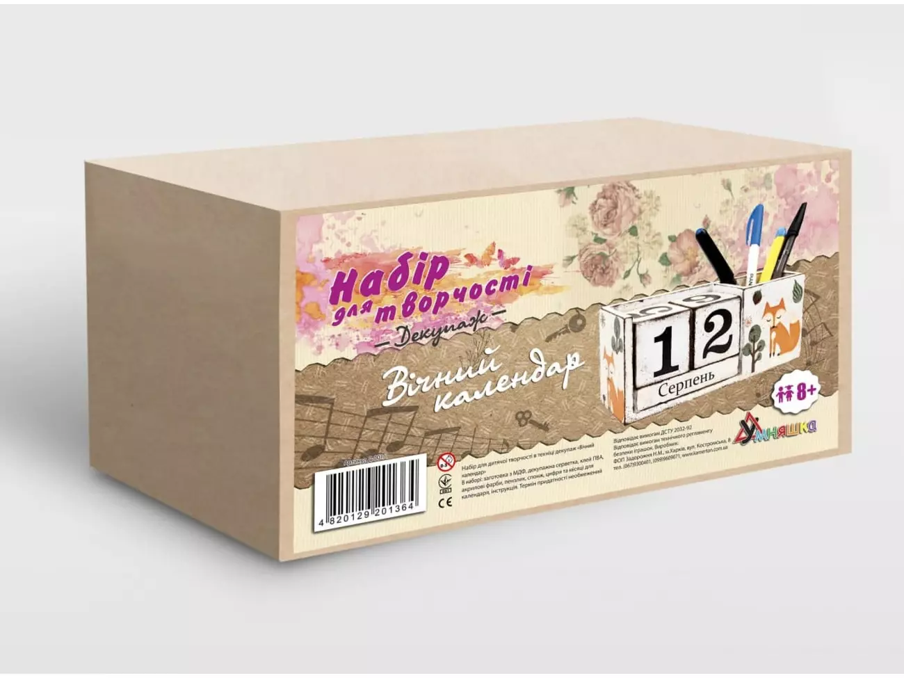 Розмір коробки ДхШхВ см -10,5х9,3х21. Розмір готового виробу ДхШхВ: 17х5,5х7,5см. У наборі: заготівля з МДФ, декупажна серветка, клей ПВА, акрилові фарби, кисть д / декупажу, спонж, цифри і місяці для календаря. Для дітей від 8 років.
