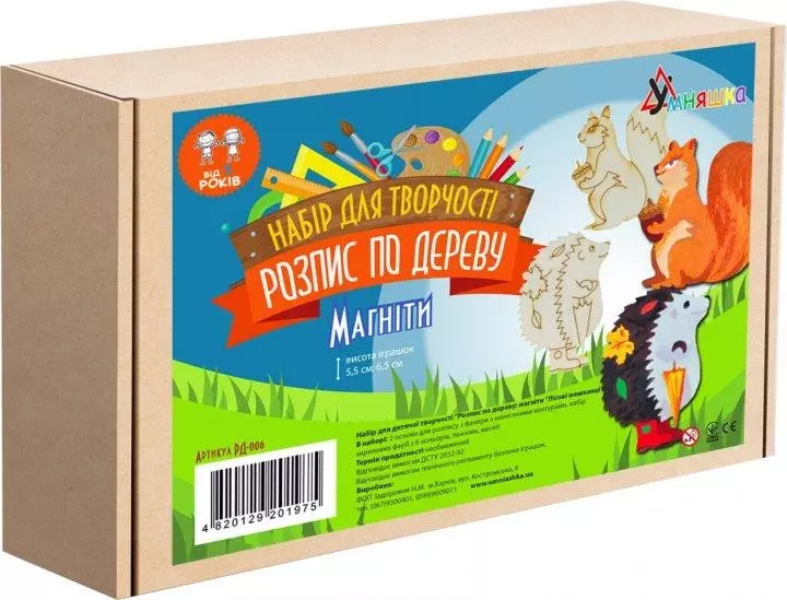 Розмір коробки ДхШхВ см 16,5х4,2х11,4. Розмір готових виробів 5 та 6 см. У наборі: 2 основи для розпису з фанери з нанесеними контурами, набір акрилових фарб з 6 кольорів, пензлик, магніт Для дітей від 6 років.