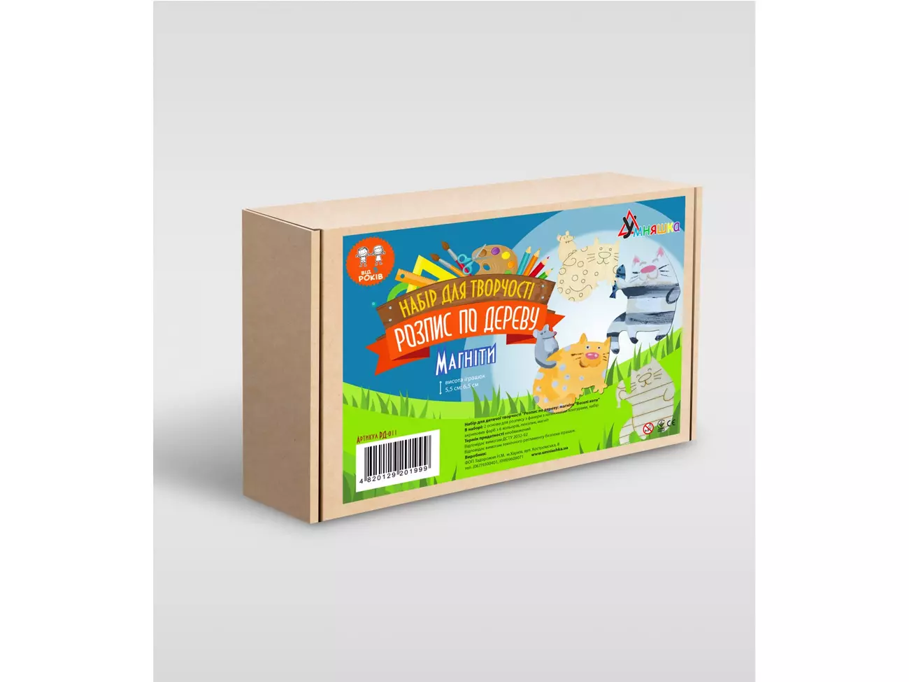 Розмір коробки ДхШхВ см 16,5х4,2х11,4. Розмір готових виробів 5 та 6 см. У наборі: 2 основи для розпису з фанери з нанесеними контурами, набір акрилових фарб з 6 кольорів, пензлик, магніт Для дітей від 6 років.