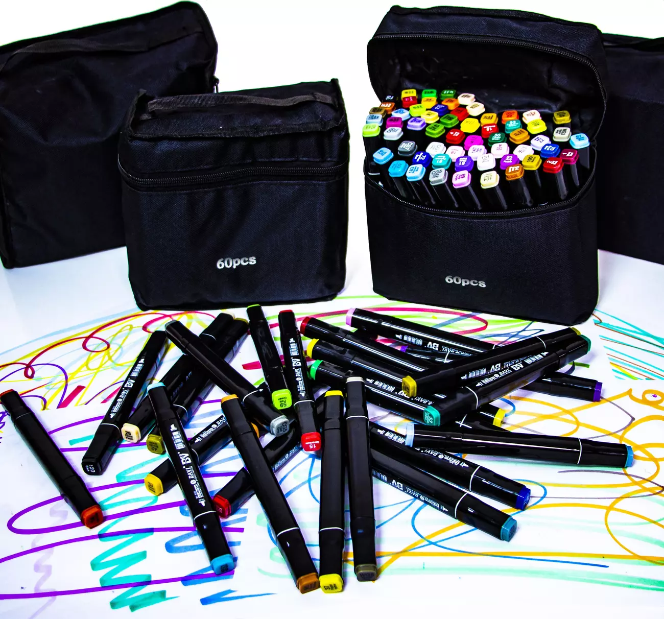 Спиртові маркери для тих, хто захоплений малюванням та каліграфією, любить створювати комікси та мальовничі ескізи. У наборі 60 маркерів різних кольорів. Корпус пластиковий гладкий. Ковпачки щільно закриваються. Кожен маркер має два наконечники різної форми для різних типів робіт. Загострений наконечник для тонких ліній та контурів. Плоский наконечник із скошеним краєм для широких штрихів. Для зручності розпізнавання типу пера кінці маркерів пофарбовані різним кольором. Кожен колір має свій цифровий код, нанесений на ковпачок маркера. Чорнило на спиртовій основі добре вбирається в папір, тому рекомендується використовувати щільні листи або картон. Кольори добре поєднуються між собою, перехід відтінків плавний. Хороший вибір відтінків для шкіри людини Довжина маркера 16,8 см.