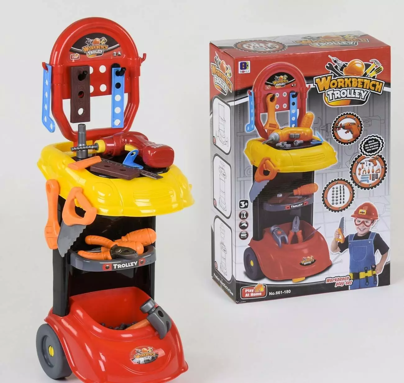 Ігровий набір інструментів «Верстат» 661-180 призначений для хлопчиків, які прагнуть бути схожими на батька і стати справжніми робимо своєї справи. Іграшка допоможе малюкам познайомитися з різними робочими інструментами. Ігровий набір являє собою верстак на коліщатках, на якому зберігається набір, що містить більше 40 інструментів: • Дрель з обертовим свердлом (працює від 2-х батарейок типу АА); • Молоток; • Пила; • Розвідний ключ; • Викрутки; • Плоскогубці; • Косинець; • Гайки; • Шурупи; • Інші елементи. Всі деталі виконані з пластика в одній колірній гамі. Ігровий набір допоможе хлопчикові розібратися в принципах роботи і сферах вживання тих чи інших видів інструментів. Дозвольте вашому юному майстрові проводити час весело і з користю завдяки набору інструментів 661-180.