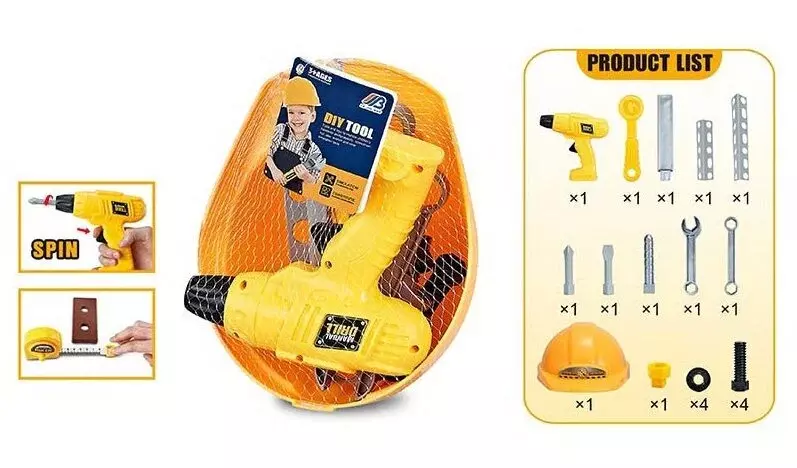 Іграшковий набір базових інструментів приведе допитливих хлопчиків у справжній захват! Тепер офіційно можна крутити та забивати, не боючись пошкоджень. Набір включає каску, яка захистить голову малюка та придасть грі більшу реалістичність, а також 11 різних елементів, які допоможуть дитині відточувати свою майстерність. Особливості: - набір виконаний із міцного пластику; - включає 12 елементів; - чудова деталізація всіх інструментів; - тренувальні куточки, в які треба закручувати болти; - шуруповерт обладнаний заводним механізмом. Комплектація: - шуруповерт; - плоскогубці; - гайки; - болти; - 2 тренувальних куточки; - 2 гайкові ключі; - 2 рукоятки та 4 насадки; - захисна каска.