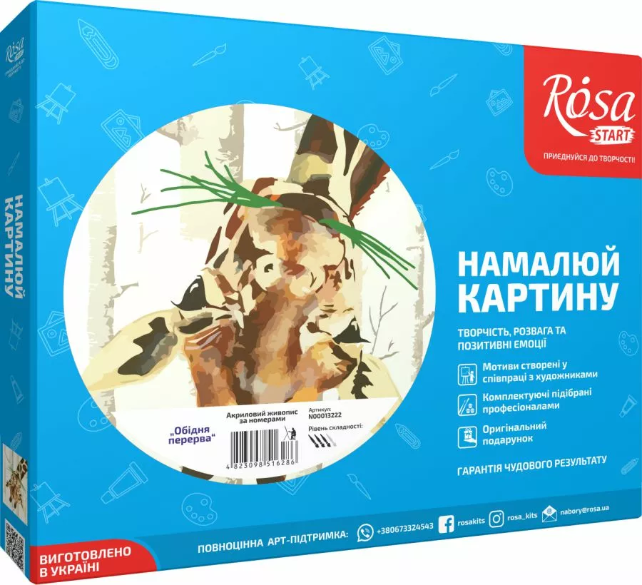 Стати справжнім художником легко завдяки наборам для творчості ROSA START! Процес створення картини дуже захоплюючий і легкий одночасно, адже малювати потрібно по пронумеровані схемою. Контури картини нанесені на полотно, області поділені на окремі сегменти з номерами, яким відповідає номер на баночці з фарбою. Поступово зафарбовуючи їх, Ви отримуєте готову картину! Разом з картинами за номерами ROSA START кожен, незалежно від віку, зможе самостійно писати картини і поступово розкрити в собі талант художника. Саме тому, перше, на що варто звернути увагу при виборі картини за номерами - це рівень складності. Картини за номерами ROSA START в подарунковій коробці мають чотири рівні складності, визначити які можна за допомогою відповідної позначки на етикетці. Склад набору: - полотно на підрамнику 35х45 см з контуром і нумерацією - якісна синтетична кисть ROSA START - 2шт - схема картини - набір акрилових фарб - кольорове зображення картини Набір виготовлений і укомплектований в Україні. Під пильною увагою фахівців він проходить всі життєві цикли, щоб потрапити до Вас в руки. Набори для творчості ROSA START - відмінний подарунок для дітей від 7 років, чоловіків і жінок будь-якого віку. Створюйте свої власні шедеври разом з наборами для творчості ROSA START !!!