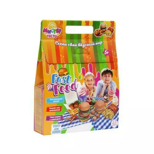 Ваш малюк любить пригощати друзів і готувати їжу? Допоможіть створити йому власне кафе швидкого харчування з допомогою набору «Містер тісто - Fast food» (Strateg 71211). Велика кількість різних видів смачної їжі допоможуть відтворити формочки, кухонний набір, кондитерський шприц і тарілочки для сервірування. Можна сфантазувало будь-який вид смачного частування і виліпити його зі спеціального тесту. Тісто дуже пластично, різні кольори легко змішуються, воно не забруднює руки і може приймати будь-яку форму. Має яскраві кольори і абсолютно безпечно. Додатковий ефект страв додадуть стіки з блискітками! Готові страви можна сервірувати на тарілочках і в спеціальному стаканчику. У комплекті є барвиста інструкція із зразками готових страв. Склад тіста: вода, пшеничне борошно, сіль, консервант, барвник, масло, хлорид кальцію, сорбат калію. Вік: 5 + Матеріал: пластик, тісто; Комплект: 3 контейнера з тістом (100 гр.), 6 паличок тіста (20 гр.), ємність для зберігання, 4 кухонних предмета, квадратна форм, кругла форма, шприц, 2 фігурних насадки, 4 форми для кексів, 2 тарілки, стаканчик , інструкція; Розмір упаковки: 26 х 35 х 8 см.
