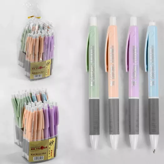 Матеріал корпусу - пластик; Колір чорнила - синій; Подача стрижня - автоматична; Товщина лінії - 0.8 мм; Заміна стрижня - є; Наявність вставок - гумова накладка; Корпус виконаний в 3-х кольорах Упаковка - пакет; В упаковці - 50 штук.