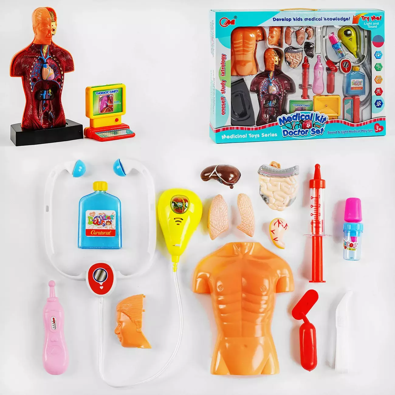 Кожному лікарю-початківцю необхідно хороше обладнання для порятунку багатьох життів. Набір доктора 3305 В відмінно підійде для цих цілей і точно сподобається Вашій дитині! Особливості моделі: - симуляція докторського прийому; - манекен тулуба людини із різними органами; - стетоскоп зі звуковими та світловими ефектами; - УЗД-апарат з яскравим мерехтливим світлом; - виконана з первинного пластику і пофарбована в яскраві кольори. Великий набір лікаря однозначно вразить молодого лікаря своїми різноманітними аксесуарами та деталями. Крім класичного медичного обладнання як стетоскоп, шприц, градусник, колбочки тощо, у наборі також є УЗД-апарат та манекен людського тулуба для вивчення анатомії. Комплектація: - тіло людини; - 7 органів; - шприц; - УЗД-апарат; - градусник; - колба; - пробірка; - щипці; - стетоскоп; - мед. пляшечка.