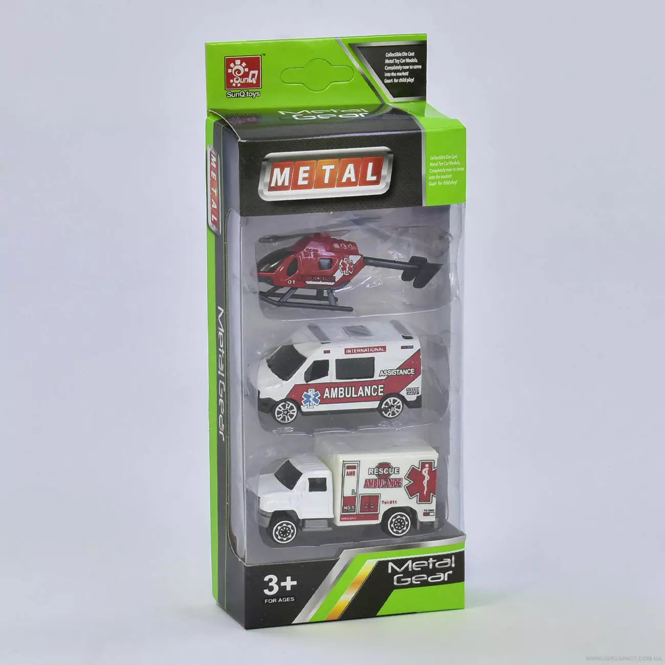 Металеві моделі транспорту швидкої допомоги з набору SQ 80333-5 Н (вертоліт, машина швидкої допомоги і транспортний фургон) виконані в максимально реалістичному дизайні. Металевий корпус і відмінна деталізація роблять іграшки привабливими як для сюжетно-рольових ігор, так і для колекціонування. Розмір моделі (ДхШхВ) ± 7 х 3 х 3 см.