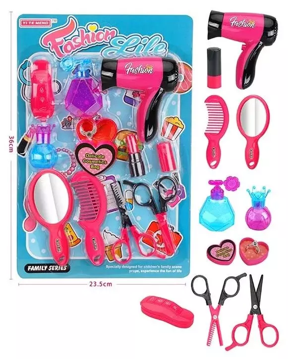 Набір перукаря 58497 допоможе маленькій дівчинці перетворитися на першокласного стиліста, який відкрив свій перший салон краси! Особливості: - великий набір аксесуарів; - всі ігрові елементи виконані з первинного пластику та пофарбовані у приємні кольори; - тематичні ігри у “стилістів” сприяють розвитку фантазії та креативного мислення; - дитина зможе як ближче познайомитися з особливостями діяльності, отримати навички володіння інструментами, а й виробити своє індивідуальне почуття стилю. Комплектація: - 2 види ножиць; - кільце в коробочці; - гребінець; - дзеркало; - фен; - 2 флакончики; - футляр із помадою; - брелок.