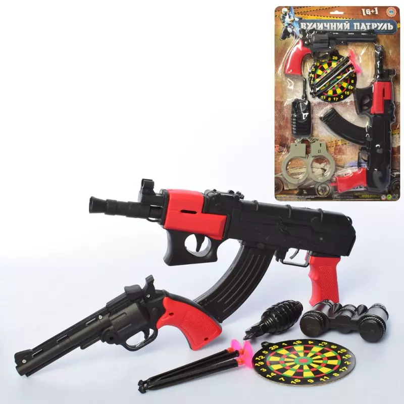 Набір поліції E 01 AK 6-7 ZY У наборах: автомат, пістолет (стріляє кулями на присосках), мішень. Вміст наборів представлений на фото. Упаковка – на листі (29-43 см).