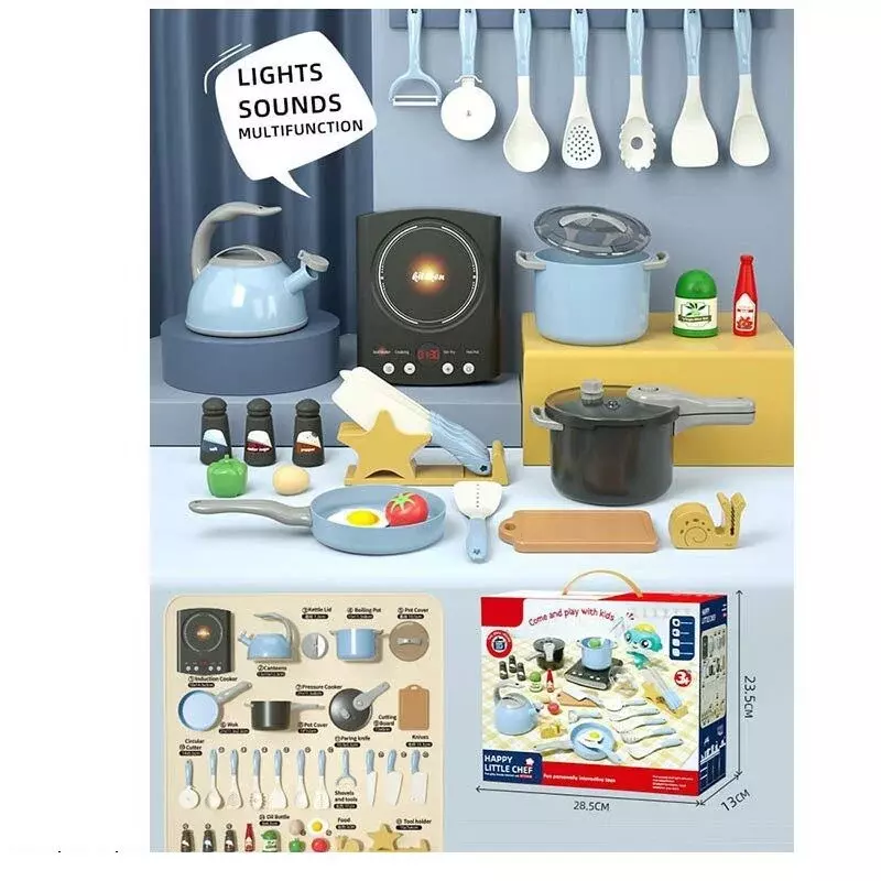 Ми маємо дещо насправді особливе для Ваших юних господинь та господарів. “Happy Little Chef” - набір посуду, про який мріє кожен маленький шеф-кухар, і без якого просто неможливе створення кулінарних шедеврів. Іграшковий посуд покращить комунікативні навички дитини, стане чудовим способом розвинути уяву та фантазію, навчить використовувати кухонні предмети за призначенням, а також наповнить будні дитини гарним настроєм та позитивними емоціями. Особливості: - посуд має сучасний дизайн та виконаний у стильному поєднанні кольорів; - всі ігрові елементи чудово деталізовані та виглядають максимально реалістично; - набір містить 31 предмет; - плитка працює від 3-х батарейок типу “АА” (не додаються); - на панелі плитки розташовані 4 функціональні кнопки: вибір меню (озвучування англійською мовою), 2 кнопки регулювання температурного режиму, кнопка вимкнення; - на дисплеї показується обрана температура; - варильна поверхня підсвічується червоним світлом; - у комплекті дитина знайде пательню, каструльки, чайник, спецівнички, ножі з підставкою і точилкою та столове приладдя; - також набір доповнений муляжними харчовими продуктами.