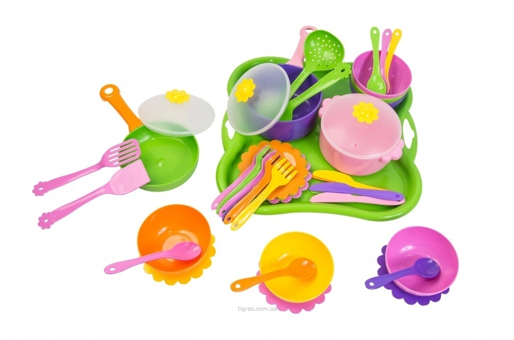 Набір іграшкового посуду столовий Ромашка 43 елементи від українського виробника Тигрес містить все, що може надихнути майбутніх господарочок і шеф-кухарів на кулінарні подвиги. Іграшковий посуд Ромашка виготовлений з безпечного харчового пластику і підходить для використання в мікрохвильовій печі і посудомийній машині. Набір представлений у великій картонній коробці, що робить його дуже презентабельним подарунком. Коробка містить елементи для вирізання у вигляді симпатичних фруктів і овочів. У набір входить: 1 каструля, 1 сковорідка, 1 сковорідка глибока, 1 ополоник, 1 шумівка, 1 лопатка кухонна, 1 лопатка кухонна з прорізами, 6 мисок глибоких, 6 тарілок, 6 ложок, 6 вилок, 6 ножів,1 рознос. Розміри: коробка - 50х45х10 см, довжина розноса - 29 см, діаметр каструлі - 10,5 см. Матеріал - поліпропілен. Упаковка - коробка.