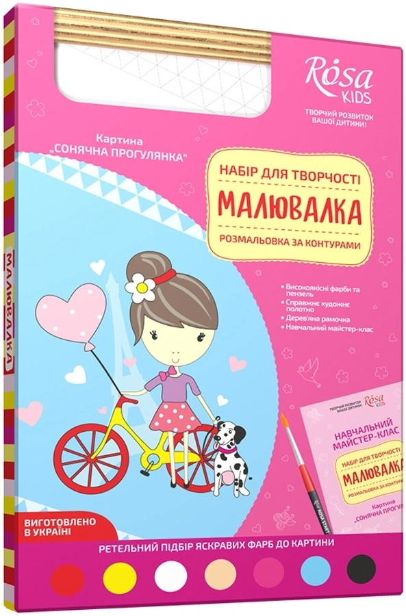 Розфарбування по контурах «Малювалка» створена спеціально для юних художників! Вона легко поєднує заняття творчістю з позитивними емоціями і допоможе дитині зануритися в дивовижний і захоплюючий світ мистецтва! Переваги акрилових фарб: не мають запаху; не жовтіють і не тріскаються; швидко сохнуть на полотні; добре змішуються між собою. Набори для творчості МАЛЮВАЛКА - це 1. Широкий вибір мотивів 2. Яскраві кольори. 3. Високоякісні матеріали 4. Майстер-клас з докладним описом змішування кольорів. 5. Прекрасний подарунок. 6. Старт дитини в майбутнє мистецтва! У наборі: Акрилові фарби 7х5 см3 з ретельним підбором яскравих кольорів до картини; Високоякісна кисть; Художнє полотно на картоні з контуром малюнка, 20х30 см; Дерев'яна рамочка; Навчальний майстер-клас.