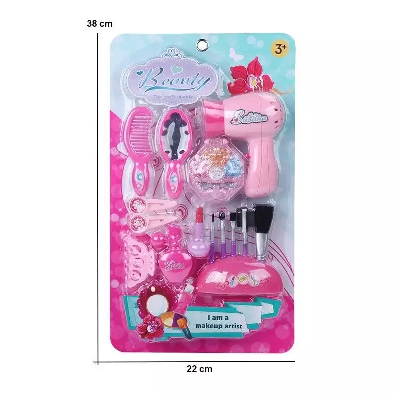 Набір стиліста BE 108 (48/2) фен, гребінець, дзеркальце, тіні, шпильки, пензлики, помада, парфуми, крабик, на листі