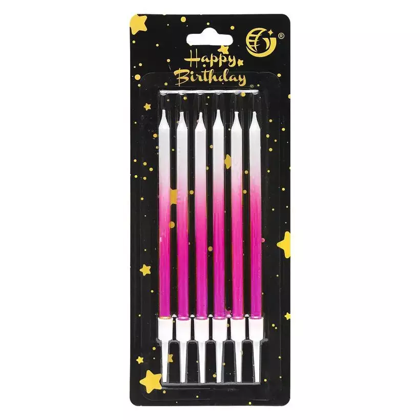 Відмінний декор для святкових тортів на День Народження. Яскраві свічки металік в торт. Купити свічки омбре довгі на торт можна в нашому інтернет-магазині. Колір: рожевий. Розмір: 11 см.