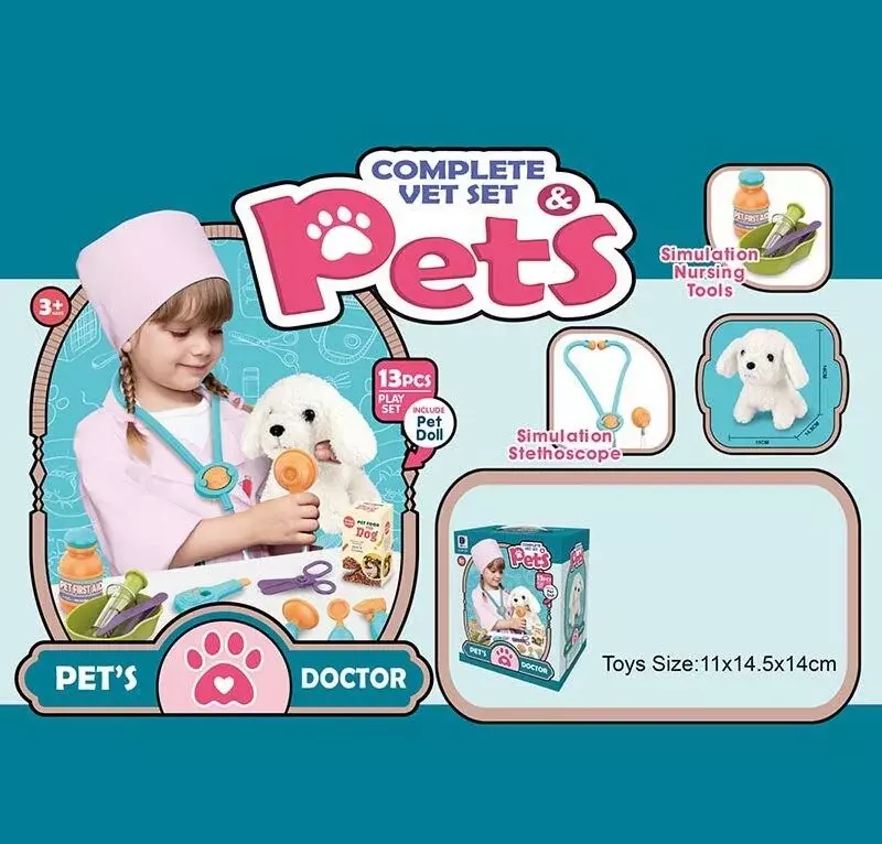Цей іграшковий набір приведе малюків у повний захват! Виконаний в приємній колірній гамі, включає одразу 12 професійних інструментів ветеринара та маленького пухнастого пацієнта. Відмінна деталізація елементів приємно здивує не тільки майбутніх спеціалістів, а і їх батьків. Набір дозволить здійснити якісне обстеження хворого хвостика та значно покращити його стан. Особливості: - виконаний у приємній колірній гамі; - включає 13 елементів; - відмінна деталізація всіх елементів; - підходить для гри в невеликій компанії друзів; - сприяє розвитку фантазії. Комплектація: - стетоскоп; - вимірювач температури; - інструменти для огляду; - ножиці; - затискач; - пінцет; - інструментальний лоток; - шприц; - ліки; - песик.
