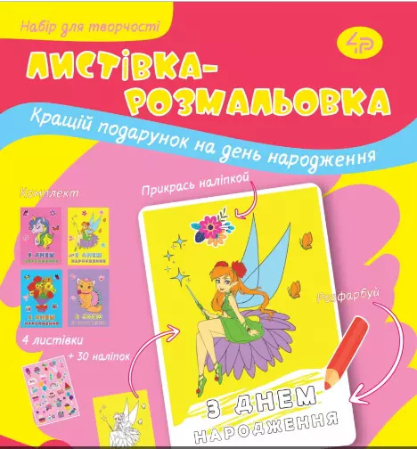 У набір входять • Листівки, А5, кольорові – 4 шт. • Лист із наклейками, А5 • Інструкція