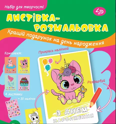 У набір входять • Листівки, А5, кольорові – 4 шт. • Лист із наклейками, А5 • Інструкція