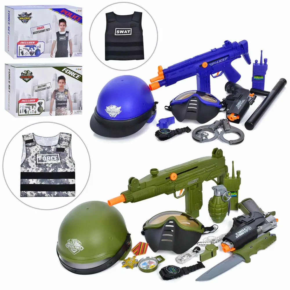 Набір зі зброєю 36330-40 (9шт) трещітка, автомат 37см, пістолет/револьвер (звук,світло, на бат-ці табл), жилет, каска, 2 види, в кор-ці, 37-26-12,5см