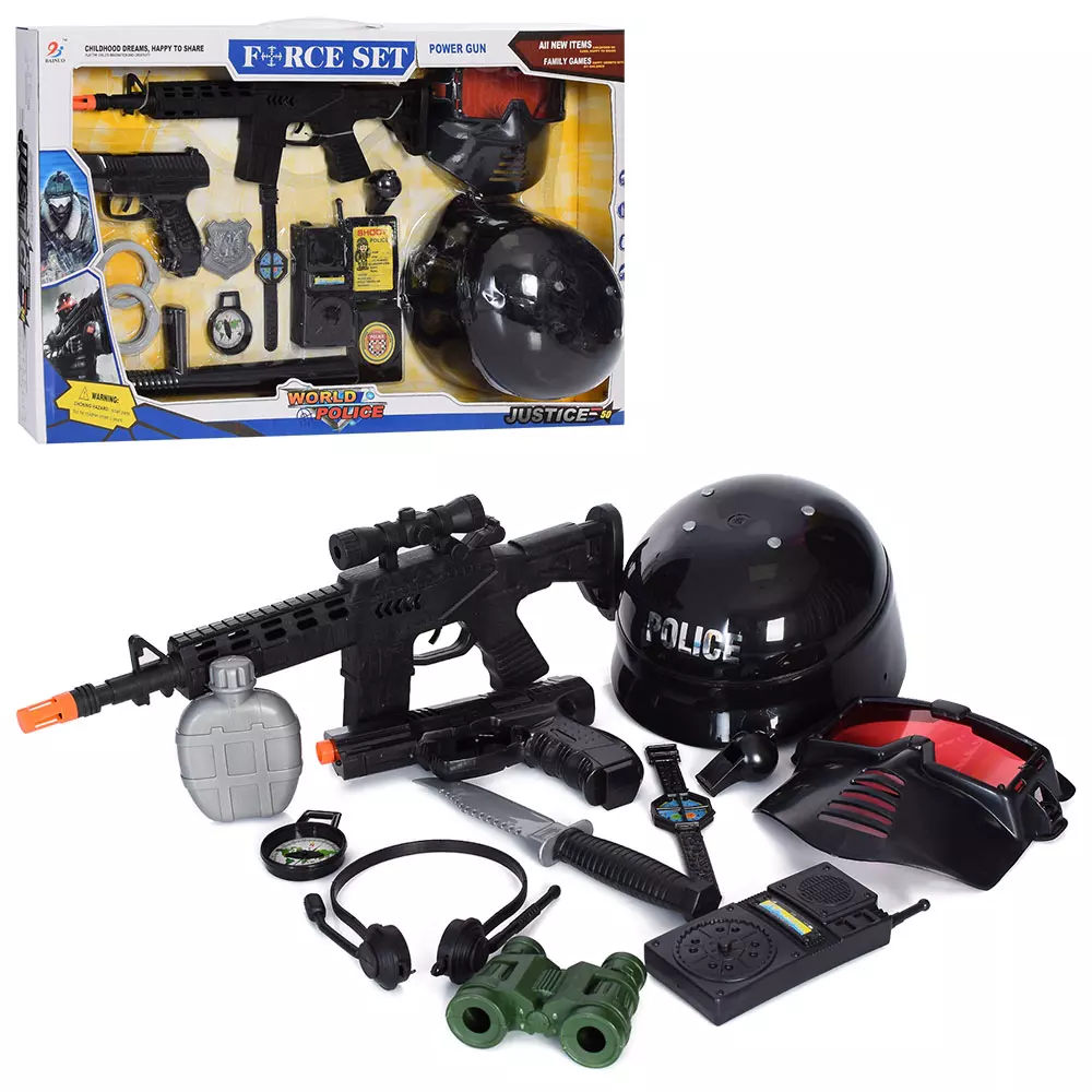 Набір зі зброєю BN369P-56-57 поліція, автомат, шолом, маска, рація, пістолет, годинник, 2види, кор.